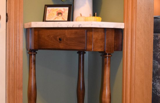 Table to fit in the corner of entry way with a drawer for keys and stamps or whatever you desire....